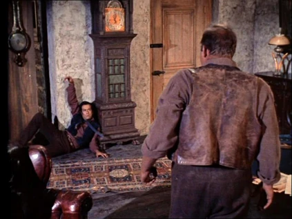 The Cartwrights ride to town and demand the return of Little Joe, but Alpheus Troy refuses to say where Joe is. He tells Ben to take it up with his associate. The associate is a gunfighter named Langford Poole. Adam insists that Poole fight him and not Ben. They square off and Poole draws. Adam is faster and wounds Poole in the arm. Still Troy won't say where Joe is. Adam suspects Lotta is involved and marches over to her hotel.