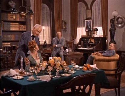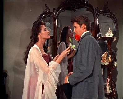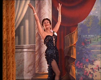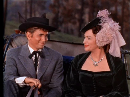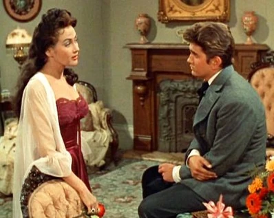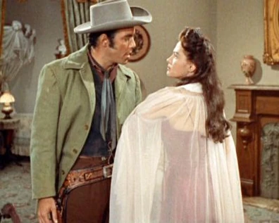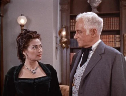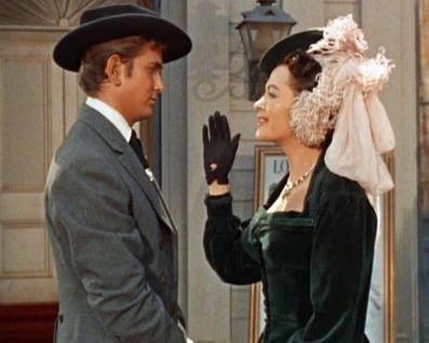 Joe attends Lotta's performance and tosses a rose to her when she's done. Then he visits her in her hotel room. He tries to make a few moves on her, but she manages to politely sidestep them. Joe gets the message and they just talk. She's been to New Orleans, which is where Joe's mother was born, and he loves to hear about it. Lotta looks out the window and sees two men she recognizes and realizes they're coming for Joe. She locks the door and begs to know why Ben won't sell his trees. Joe's now very suspicious and says, "Without those trees, we can't keep the land going. Are you expecting any visitors, ma'am?" She looks guiltily away.