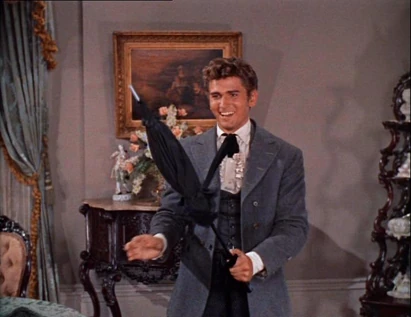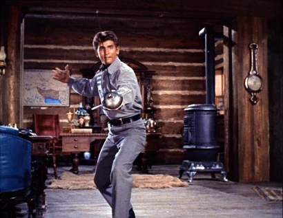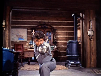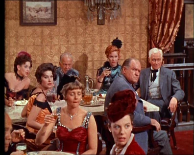 At sun up, they are riding down the main street when they hear music coming from a restaurant. They dismount and go in to find Joe dancing with Lotta as a man plays the harmonica. After his sigh of relief at finding Joe alive and well, Ben yells at Joe, "Is this what you've been doing all night?!" Joe says he was just getting started. Ben orders him out. Joe scampers away, trying to avoid getting a swat from Ben. Ben and Hoss notice that Adam hasn't taken his eyes of Lotta. As Hoss turns to follow Joe out, he gives Adam a nudge towards her. With Ben, Hoss and Joe outside, Adam steps up to Lotta and gives her a kiss. With a smile, he turns and leaves.