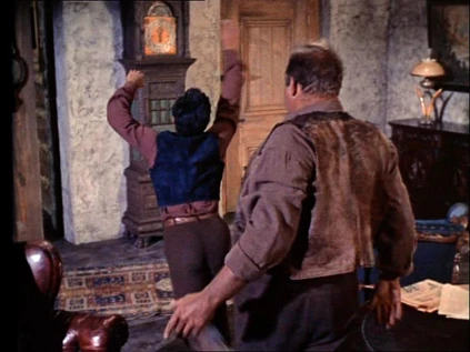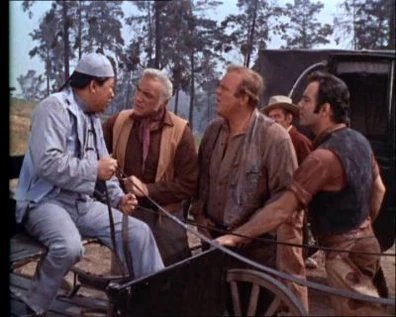 Once the wagon is fixed, the Cartwrights wonder what's taking Joe and Lotta so long. Their Chinese cook, Hop Sing, rides up in the buckboard and is upset that everyone missed lunch. But when Hop Sing says Joe took the lovely lady back to Virginia City, everyone knows there's going to be trouble. Adam pulls his gun and holds it on the driver. He threatens the driver, Ned, with one minute to tell what he knows. Ned says he was hired to drive the lady around these hills. Ben demands to know if it was Alpheus Troy who hired him. Ned admits it was. Ben says they'll gather their forces and if the three of them aren't back by dawn, their men are to ride in behind them.