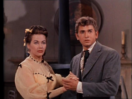 The Cartwrights spot a carriage barreling across the Ponderosa and follow it to investigate. The carriage has lost a wheel and come to a halt. The boys pull guns on the driver and demand to know what he's doing on their land. A beautiful woman, Lotta Crabtree, steps out of the carriage and refuses to cower. The Cartwrights offer to help fix the wheel Joe takes Lotta back to the house for a cool drink. Joe, who's been admiring the lady's beauty, is happy to oblige. However, Adam jumps down first and is the one to lift the woman onto Joe's horse.
