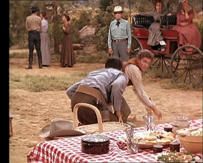 That evening at the Cartwrights' hoedown, Sam becomes friendly with Ellie McClure who Joe thinks he has some claim to. A fight breaks out and as Sam's shirt is torn, it reveals whip scars on his back. He's angry and humiliated, wanting to leave. Adam gives him his vest to cover his back. Ben demands to know what Joe has against Sam. Joe feels bad now and says he's going to go apologize to Sam.
